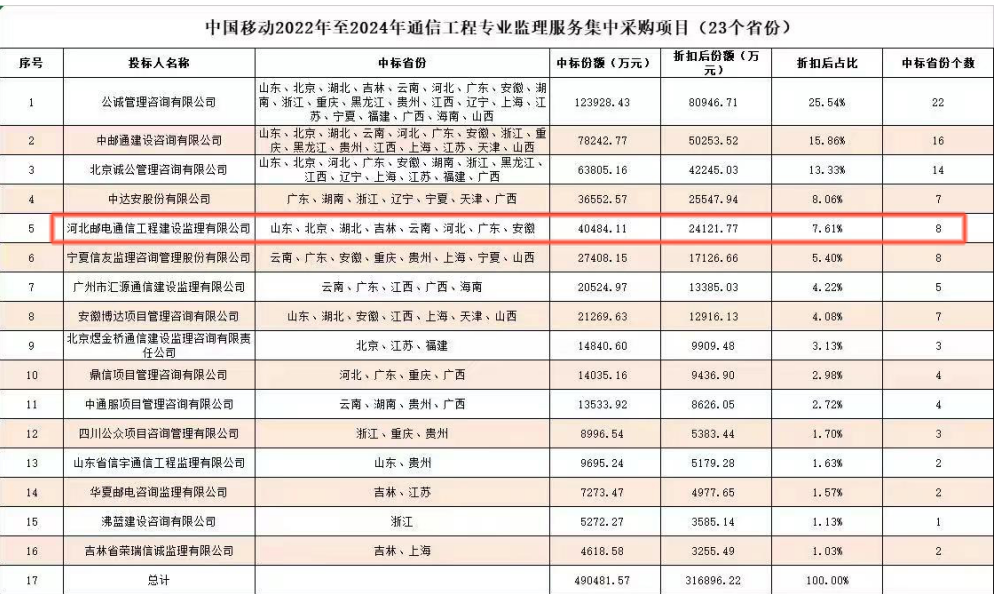 金秋十月,奋勇争先,中标喜报,乘“丰”而来!近日,在公司领导的英明决策下,在全体员工的共同努力下,我公司凭借突出的业绩、雄厚的服务实力以及良好的市场信誉,在本次中国移动2022年至2024年通信工程专业监理服务集中采购项目中,从众多竞争对手中脱颖而出,接连中标,旗开得胜,成功中标河北省,湖北省,广东省,北京市,山东省,安徽省,云南省,吉林省等八省市重点标段,中标金额:24121.77万元,移动市场区域取得了历史性突破,具有划时代的意义。感谢市场部的同事团结协作,辛勤付出,同时也感谢参与投标准备过程中各部门和分公司的共同努力。成绩的取得凝聚着同事们的辛勤付出,付出终将有回报,让我们一同来分享这份喜悦。